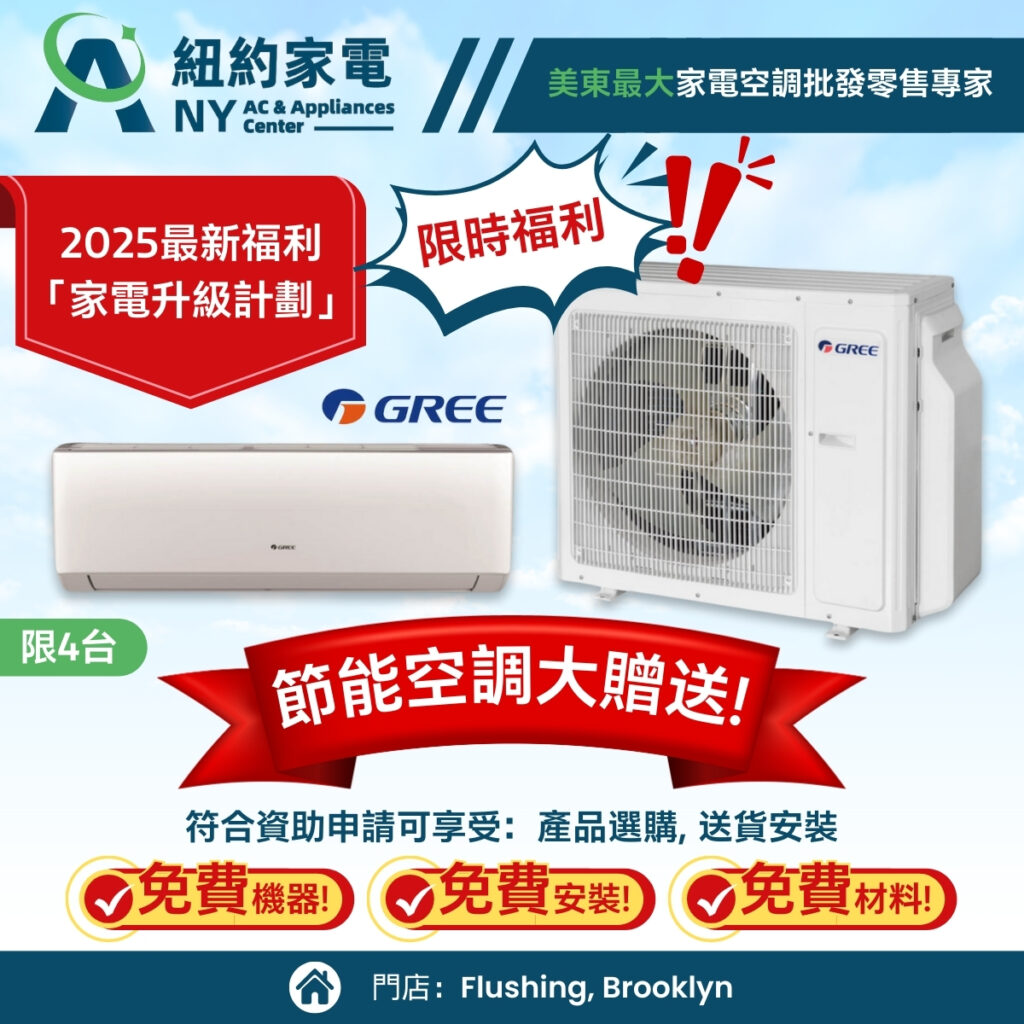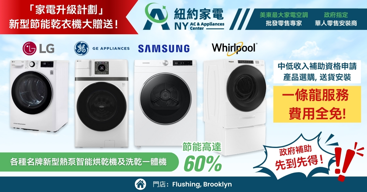 - 🔥 紐約州政府和聯邦補助計劃支持下的「家電升級計劃」(Appliance Upgrade Program),鼓勵中低收入家庭升級節能家電,購買與安裝符合標準的熱泵乾衣機或洗乾一體機。